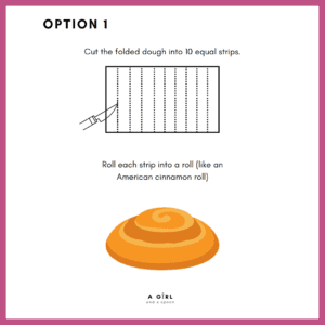 Cut the dough into ten equal strips. Then form your buns. See options in Notes.